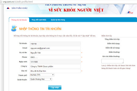 Bước 2: Sau khi đăng ký thành công, bạn ĐĂNG NHẬP và có thể vào trang cá nhân để sửa các thông tin, thay đổi mật khẩu, kiểm tra đơn hàng