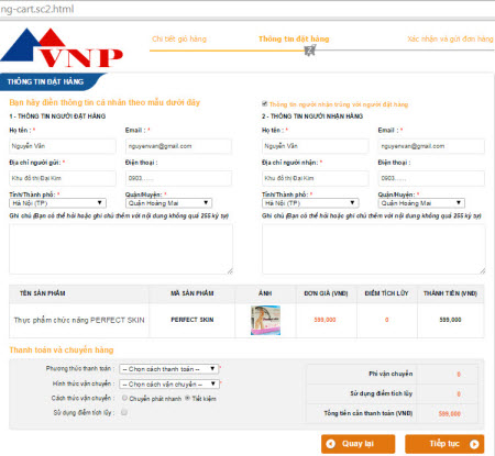 Bước 4: Khi website chuyển đến trang thanh toán, bạn điền đầy đủ thông tin theo mẫu. Nếu thông tin người nhận trùng thông tin người mua thì tích vào ô Thông tin người nhận trùng người đặt hàng.